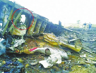 從這張殘骸照片來(lái)看,機(jī)身上有比臉盆略大的孔洞,破壞方向從機(jī)體外部沖向內(nèi)部,懷疑是導(dǎo)彈的戰(zhàn)斗部碎片擊中的一塊區(qū)域。