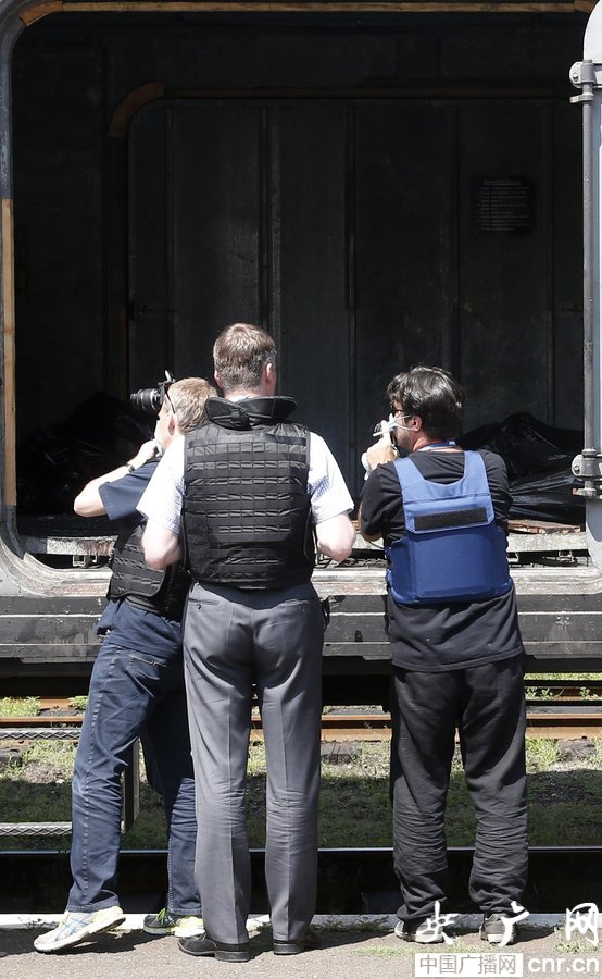 當(dāng)?shù)貢r(shí)間2014年7月20日,烏克蘭頓涅茨克Torez,馬航墜機(jī)遇難乘客遺體被裝上列車?yán)洳剀噹麑⒈贿\(yùn)走。載有部分遺體的火車從距空難現(xiàn)場不遠(yuǎn)的烏克蘭托列茲市出發(fā),前往頓涅茨克市?;疖囯x站前,身處空難現(xiàn)場的歐洲安全與合作組織(歐安組織)代表檢查了運(yùn)載遺體的5節(jié)冷藏車廂。