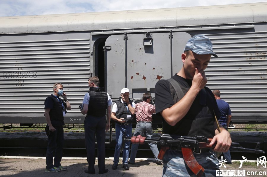當(dāng)?shù)貢r間2014年7月20日,烏克蘭頓涅茨克Torez,馬航墜機(jī)遇難乘客遺體被裝上列車?yán)洳剀噹麑⒈贿\(yùn)走。載有部分遺體的火車從距空難現(xiàn)場不遠(yuǎn)的烏克蘭托列茲市出發(fā),前往頓涅茨克市?;疖囯x站前,身處空難現(xiàn)場的歐洲安全與合作組織(歐安組織)代表檢查了運(yùn)載遺體的5節(jié)冷藏車廂。