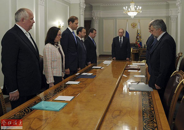 7月17日夜,在俄羅斯莫斯科州新奧加廖沃官邸,俄羅斯總統(tǒng)普京(后)和一些高級別官員在經(jīng)濟(jì)問題會議前為墜毀馬航MH17航班的遇難者默哀。普京當(dāng)晚說,馬航客機(jī)失事悲劇發(fā)生在烏克蘭領(lǐng)空,烏克蘭無疑對此承擔(dān)責(zé)任。