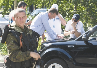 7月30日,烏克蘭頓涅茨克,歐安組織調查人員看地圖分析周圍安全形勢。由于烏內戰(zhàn)仍在繼續(xù),調查人員已經(jīng)連續(xù)4天未能進入MH17墜機現(xiàn)場。
