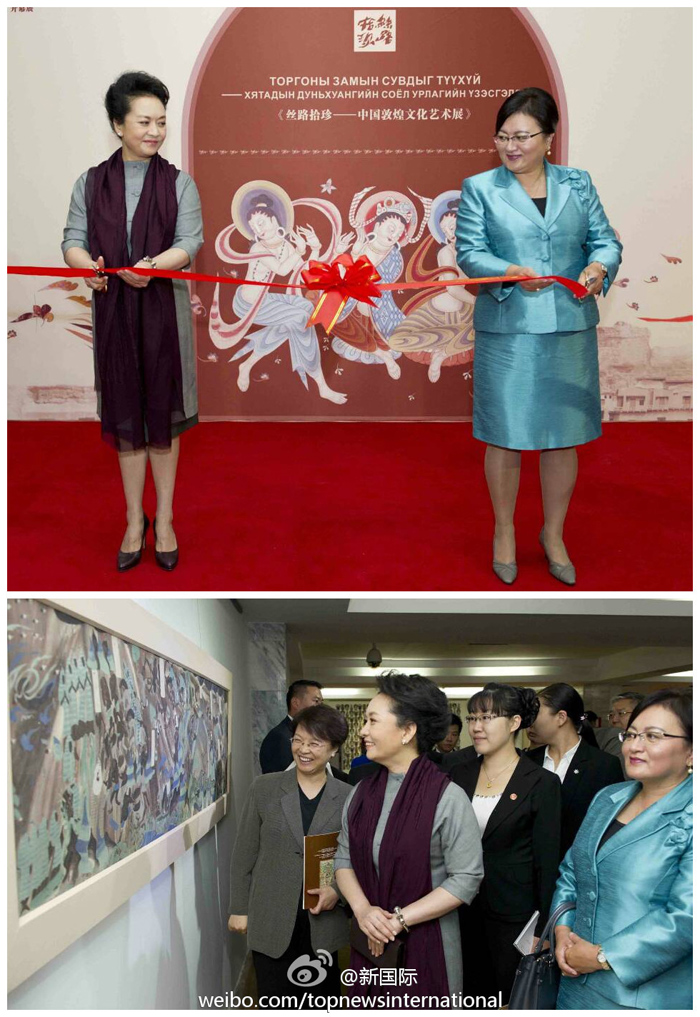 ???? 新華網北京8月22日電 據(jù)新華社“新國際”微博報道,習近平主席夫人彭麗媛和額勒貝格道爾吉總統(tǒng)夫人包勒爾瑪22日上午共同出席為慶祝中蒙建交65周年暨“中蒙友好交流年”舉行的中國文化周開幕式并剪彩,欣賞蒙古國藝術家的精彩演出,并參觀中國敦煌文化藝術展,觀賞臨摹的敦煌石窟壁畫、復制泥塑和樂器。
