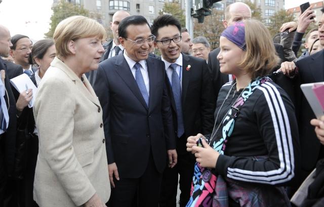 見到兩國總理到來,路邊不少民眾圍了上來,爭相與他們握手、合影。默克爾還把克強總理介紹給一位7、8歲的德國小女孩:“這是我的中國同事。”