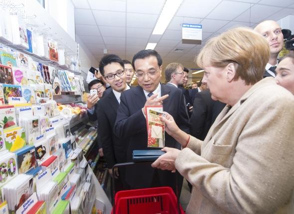 走進(jìn)超市,兩位總理邊走邊逛,默克爾不時向克強總理介紹貨架上的商品。在一個擺滿明信片的架子前,克強總理停下腳步,打算選兩張明信片送給自己的夫人和女兒。