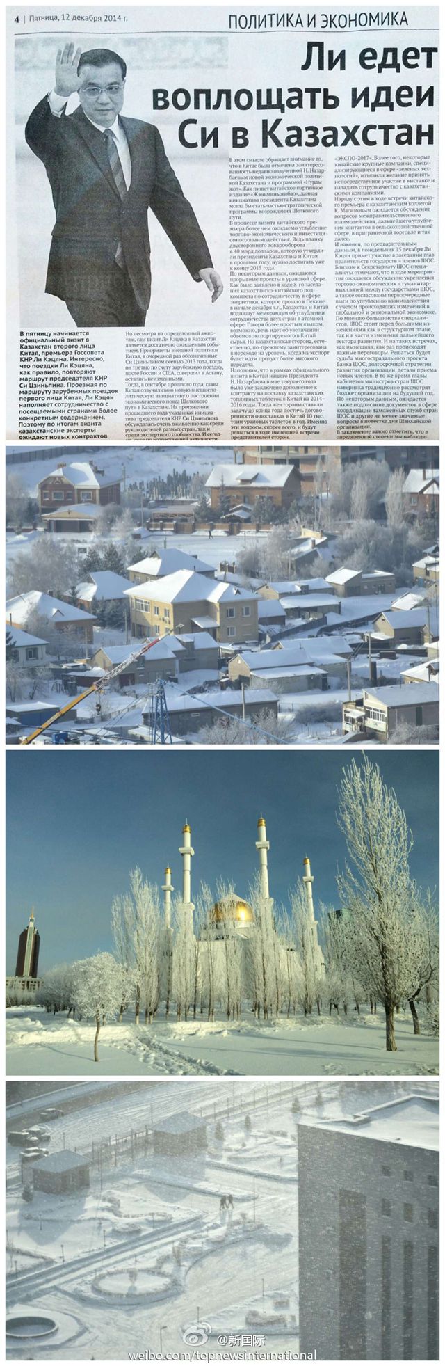 ????新華網(wǎng)北京12月13日電 據(jù)新華社“新國際”微博報(bào)道,哈薩克斯坦首都阿斯塔納冰天雪地,當(dāng)?shù)馗鹘鐚?duì)李克強(qiáng)來訪的期待卻相當(dāng)熱切。總統(tǒng)府、總理府工作人員周末都在加緊籌備。哈通社記者穆卡諾夫說,中國總理來訪對(duì)他們來說是大新聞,他和同事將全程報(bào)道。他很關(guān)心哈中合作,希望中國的發(fā)展和經(jīng)驗(yàn)?zāi)軒椭冒l(fā)展。