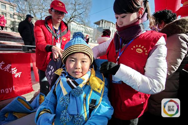 ????2015年12月21日,在甘肅平?jīng)觯驹刚呓o孩子穿上“壹基金溫暖包”內(nèi)的防寒衣物。(楊昕攝影)