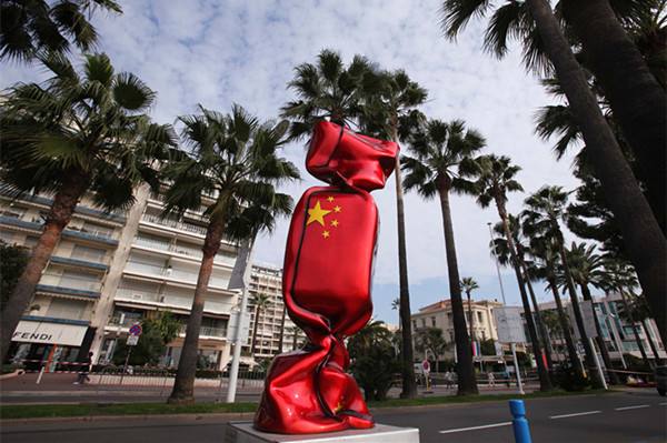 2011年11月3日至4日,G20領(lǐng)導(dǎo)人峰會(huì)在戛納舉行。圖為10月31日在法國(guó)南部小城戛納拍攝的外表被包裝成中國(guó)國(guó)旗的糖果雕塑。新華社記者高靜攝