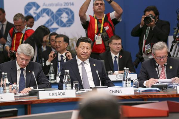 2014年11月15日,G20第九次峰會(huì)在澳大利亞布里斯班舉行。國(guó)家主席習(xí)近平出席會(huì)議并發(fā)表題為《推動(dòng)創(chuàng)新發(fā)展 實(shí)現(xiàn)聯(lián)動(dòng)增長(zhǎng)》的重要講話。 新華社發(fā)