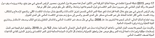 昨日,二十國集團(tuán)領(lǐng)導(dǎo)人第十次峰會在土耳其安塔利亞閉幕。中國領(lǐng)導(dǎo)人習(xí)近平期間出席了峰會,并發(fā)表題為《創(chuàng)新增長路徑 共享發(fā)展成果》的重要講話,其中強(qiáng)調(diào)二十國集團(tuán)要加強(qiáng)宏觀經(jīng)濟(jì)政策溝通和協(xié)調(diào),推動改革創(chuàng)新,構(gòu)建開放型世界經(jīng)濟(jì)。