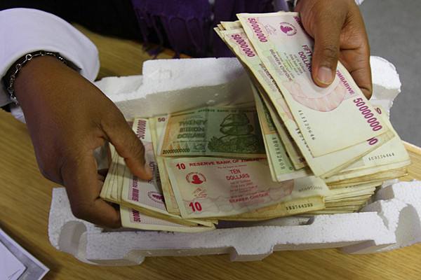 2015年6月15日,在首都哈拉雷一家銀行內(nèi),一名當(dāng)?shù)厝四弥蛟獪?zhǔn)備兌換美元。津巴布韋當(dāng)日起回收不再流通的津巴布韋元,1張100萬(wàn)億津元紙幣僅可兌換40美分。(新華社發(fā))
