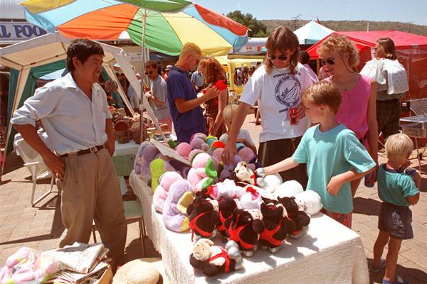 圖為1997年北京商人在布魯馬跳蚤市場上出售中國玩具。(新華社記者李曉果攝)