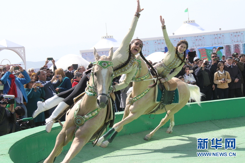 3月21日,在土庫(kù)曼斯坦首都阿什哈巴德,演員們表演汗血馬馬術(shù)。新華社記者盧敬利 攝