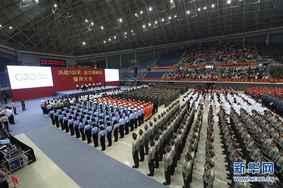 ??? 5月27日,駐杭部隊(duì)官兵、武警官兵、公安干警、志愿者、醫(yī)護(hù)人員、賓館保障人員及各界代表參加誓師大會(huì)。 當(dāng)日,“決戰(zhàn)100天全力保峰會(huì)”迎接G20誓師大會(huì)在浙江杭州舉行。 新華社記者黃宗治攝
