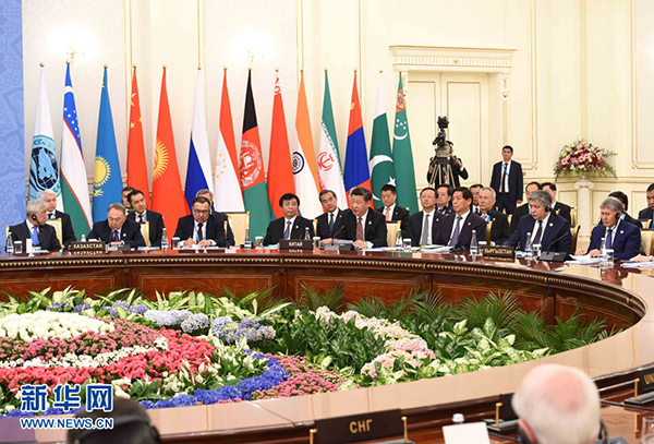 成員國元首先舉行小范圍會談,隨后邀請觀察員國阿富汗總統(tǒng)加尼、白俄羅斯總統(tǒng)盧卡申科、印度總理莫迪、蒙古國總統(tǒng)額勒貝格道爾吉、巴基斯坦總統(tǒng)侯賽因、伊朗外交部長扎里夫,主席國客人土庫曼斯坦總統(tǒng)別爾德穆哈梅多夫以及有關國際和地區(qū)組織代表參加大范圍會談??ɡ锬蛑鞒謺h。會議審議了上海合作組織成立15年來的主要成果。與會各方圍繞上海合作組織發(fā)展及當前重大國際和地區(qū)問題交換意見,達成廣泛共識。
