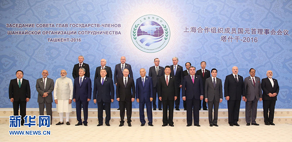 6月24日,國家主席習近平在烏茲別克斯坦塔什干出席上海合作組織成員國元首理事會第十六次會議并發(fā)表重要講話。這是大范圍會談開始前,習近平同哈薩克斯坦總統(tǒng)納扎爾巴耶夫、吉爾吉斯斯坦總統(tǒng)阿坦巴耶夫、俄羅斯總統(tǒng)普京、塔吉克斯坦總統(tǒng)拉赫蒙、烏茲別克斯坦總統(tǒng)卡里莫夫,觀察員國阿富汗總統(tǒng)加尼、白俄羅斯總統(tǒng)盧卡申科、印度總理莫迪、蒙古國總統(tǒng)額勒貝格道爾吉、巴基斯坦總統(tǒng)侯賽因、伊朗外交部長扎里夫,主席國客人土庫曼斯坦總統(tǒng)別爾德穆哈梅多夫以及有關國際和地區(qū)組織代表集體合影。新華社記者 丁林 攝