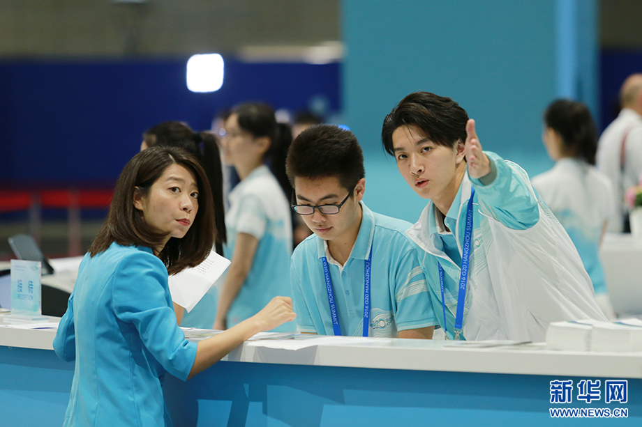 ????“小青荷”是此次峰會(huì)志愿者的代名詞。這個(gè)名字取自宋代詩人楊萬里描寫杭州的詩句“接天蓮葉無窮碧,映日荷花別樣紅”,“青荷”也音同“親和”,他們成了G20杭州峰會(huì)新聞中心里一道亮麗的風(fēng)景。新華網(wǎng) 祝立銘 攝