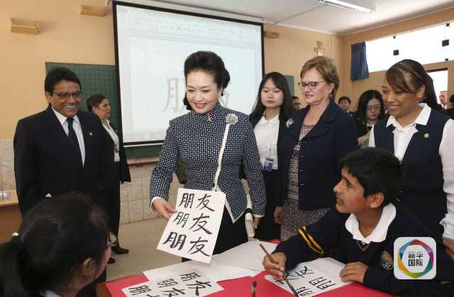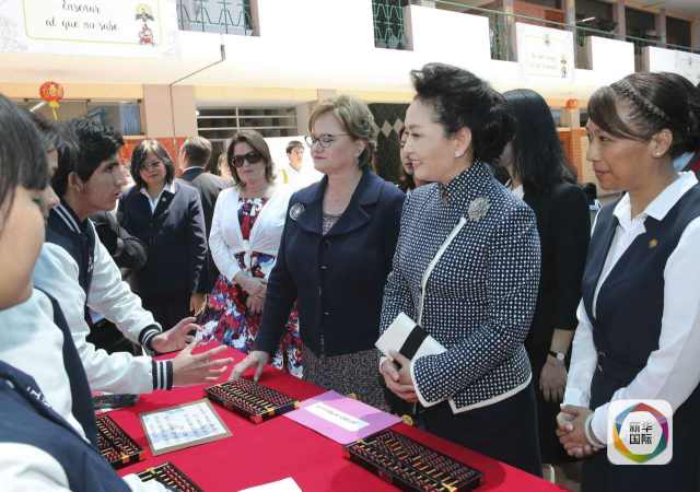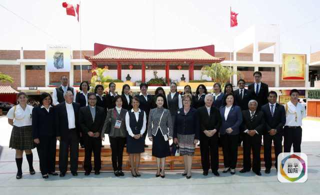 ??? 彭麗媛抵達(dá)時(shí),秘魯總統(tǒng)夫人蘭格和學(xué)校校長(zhǎng)在下車處迎接,校長(zhǎng)為彭麗媛獻(xiàn)上鮮花。若望二十三世秘中學(xué)校創(chuàng)辦于1962年,是從幼兒園到中學(xué)教育的全日制學(xué)校,也是秘魯乃至南美洲最具影響的華文學(xué)校之一。