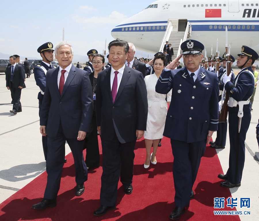 11月22日,國家主席習(xí)近平抵達(dá)圣地亞哥,對(duì)智利共和國進(jìn)行國事訪問。智利外長(zhǎng)穆尼奧斯等在機(jī)場(chǎng)迎接習(xí)近平和夫人彭麗媛。 新華社記者蘭紅光 攝
