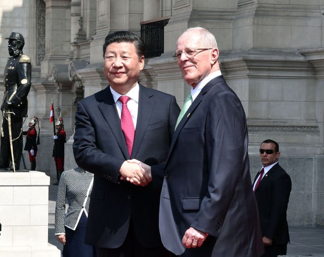11月21日,國家主席習(xí)近平在利馬同秘魯總統(tǒng)庫琴斯基舉行會(huì)談。會(huì)談前,習(xí)近平出席庫琴斯基在總統(tǒng)府前廣場(chǎng)舉行的歡迎儀式。(新華社記者 李濤 攝)