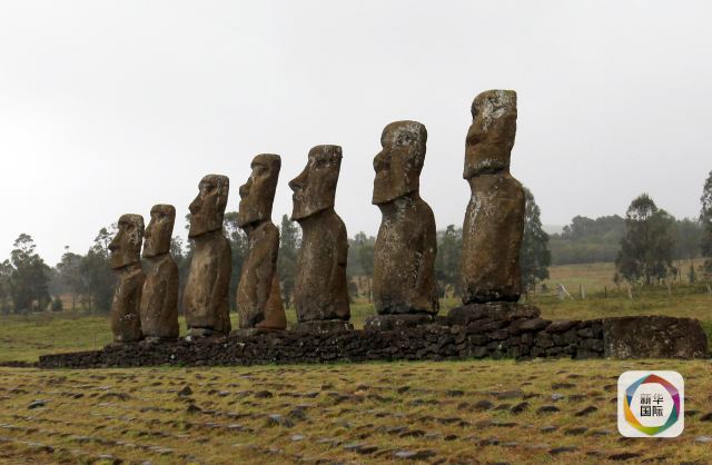 復活節(jié)島上的巨人石像排成一列。(新華社記者葉書宏攝)