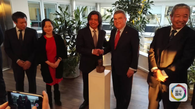 1月16日國(guó)際奧委會(huì)主席巴赫與來(lái)訪的中國(guó)雕塑家吳為山合影留念。新華社記者高鵬攝
