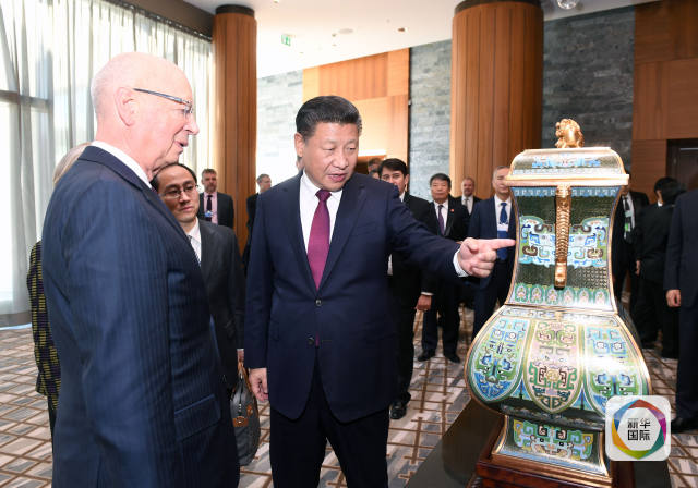 1月17日,國(guó)家主席習(xí)近平在瑞士達(dá)沃斯會(huì)見(jiàn)世界經(jīng)濟(jì)論壇主席施瓦布。這是習(xí)近平向施瓦布介紹中華人民共和國(guó)贈(zèng)送給世界經(jīng)濟(jì)論壇的四面方尊。(新華社記者 饒愛(ài)民 攝)