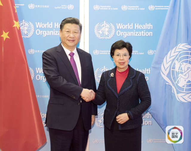 1月18日,國家主席習近平在瑞士日內(nèi)瓦訪問世界衛(wèi)生組織并會見陳馮富珍總干事。(新華社記者李學仁攝)