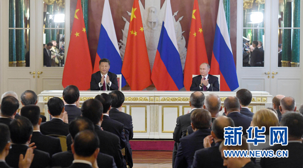7月4日,國(guó)家主席習(xí)近平在莫斯科克里姆林宮同俄羅斯總統(tǒng)普京舉行會(huì)談。會(huì)談后,兩國(guó)元首簽署了《中華人民共和國(guó)和俄羅斯聯(lián)邦關(guān)于進(jìn)一步深化全面戰(zhàn)略協(xié)作伙伴關(guān)系的聯(lián)合聲明》《中華人民共和國(guó)和俄羅斯聯(lián)邦關(guān)于當(dāng)前世界形勢(shì)和重大國(guó)際問題的聯(lián)合聲明》,批準(zhǔn)了《〈中華人民共和國(guó)和俄羅斯聯(lián)邦睦鄰友好合作條約〉實(shí)施綱要(2017年至2020年)》并見證了《中華人民共和國(guó)外交部和俄羅斯聯(lián)邦外交部關(guān)于朝鮮半島問題的聯(lián)合聲明》以及經(jīng)貿(mào)、農(nóng)業(yè)、能源、基礎(chǔ)設(shè)施建設(shè)、金融、文化、創(chuàng)新、媒體、信息網(wǎng)絡(luò)、檢驗(yàn)檢疫等領(lǐng)域多項(xiàng)雙邊合作文件的交換。新華社記者 謝環(huán)馳 攝