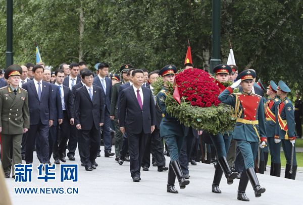 7月4日,國(guó)家主席習(xí)近平在莫斯科向俄羅斯無名烈士墓敬獻(xiàn)花圈。新華社記者 謝環(huán)馳 攝
