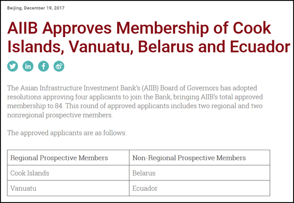 【第四次“擴容”】2017年12月19日,亞投行宣布批準庫克群島、瓦努阿圖、白俄羅斯和厄瓜多爾四個成員的加入申請,成員增至84個,這是亞投行自開業(yè)以來的第四次“擴容”。圖為亞投行官網(wǎng)截圖。(新華網(wǎng)國際頻道 徐海知)