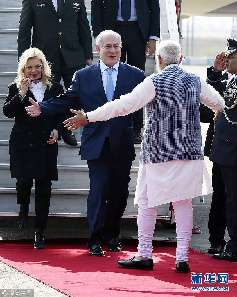 當?shù)貢r間1月14日,印度新德里,以色列總理內塔尼亞胡抵達印度展開訪問。(圖片來源:視覺中國)