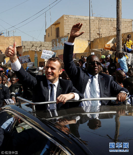 當(dāng)?shù)貢r(shí)間2月3日,塞內(nèi)加爾圣路易,塞內(nèi)加爾總統(tǒng)馬基·薩勒陪到訪的法國(guó)總統(tǒng)馬克龍?jiān)煸L當(dāng)?shù)?,兩人乘車向民眾致意。(圖片來源:視覺中國(guó))
