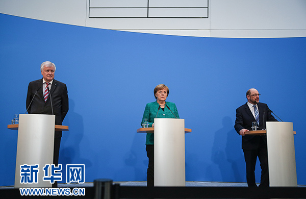 ??? 2月7日,在德國柏林的基民盟總部,德國總理、聯(lián)盟黨領(lǐng)導(dǎo)人默克爾(中),社會(huì)民主黨主席舒爾茨(右)和基社盟主席澤霍費(fèi)爾出席新聞發(fā)布會(huì)。據(jù)德國媒體報(bào)道,德國聯(lián)盟黨(由基民盟和基社盟組成)和社會(huì)民主黨(社民黨)7日就聯(lián)合組閣協(xié)議達(dá)成一致。 新華社記者單宇琦攝