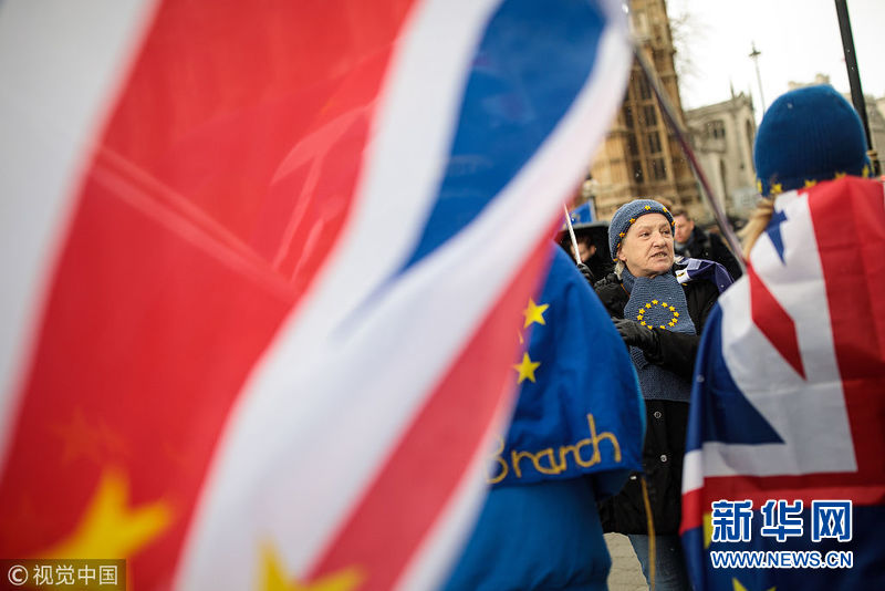 2月26日,英國倫敦,示威者在議會(huì)大廈外抗議“脫歐”。(圖片來源:視覺中國)