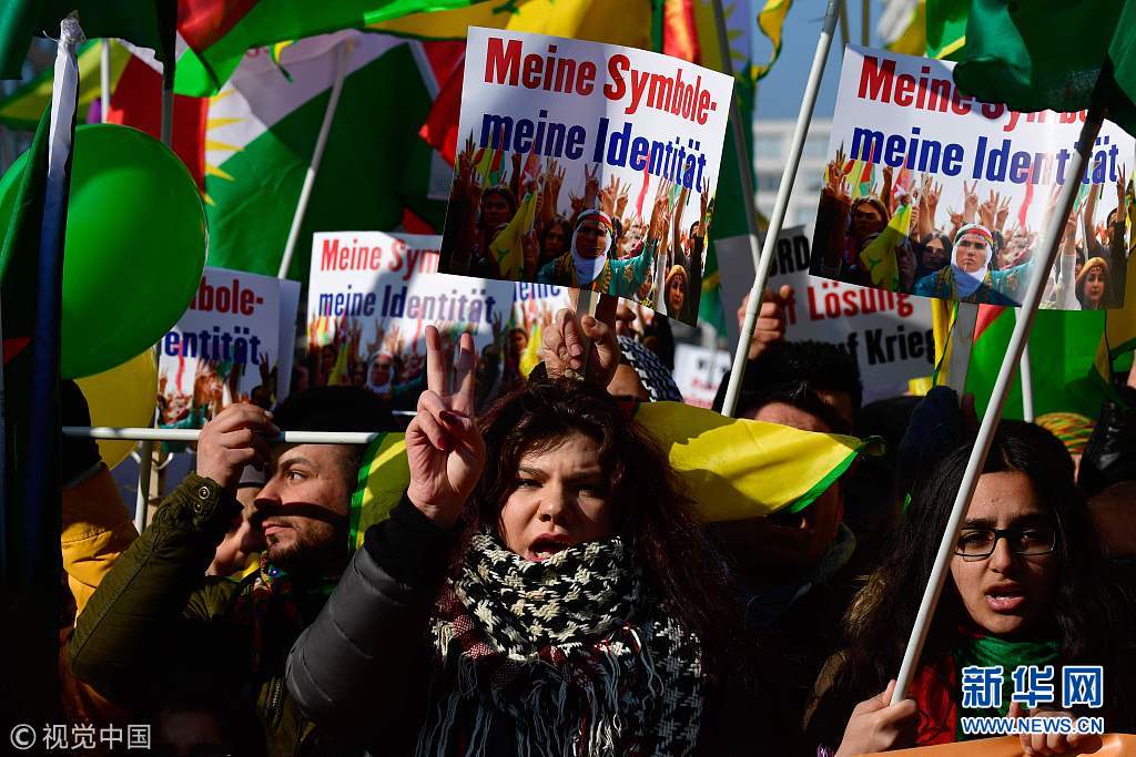 當?shù)貢r間2018年3月3日,德國柏林,當?shù)孛癖娕e行游行,抗議土耳其對敘利亞阿夫林地區(qū)的庫爾德人采取軍事行動。(圖片來源:視覺中國)