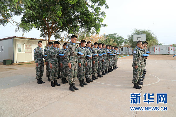 祭奠儀式上,大型機(jī)械鳴笛三聲,哀思樂(lè)曲響起,全體官兵整裝列隊(duì),集體脫帽為犧牲在維和戰(zhàn)場(chǎng)上的英烈默哀三分鐘。隨后,官兵代表致辭,追憶維和英烈們無(wú)私奉獻(xiàn)、舍生取義的光輝事跡,表達(dá)為達(dá)爾富爾地區(qū)和平建設(shè)而努力奮斗的堅(jiān)定決心。
