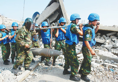 中國維和部隊官兵在黎巴嫩南部轉(zhuǎn)移未爆航彈。資料照片(新華社發(fā))