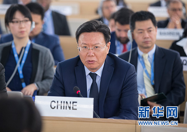 5月18日,在瑞士日內(nèi)瓦萬國(guó)宮,中國(guó)常駐聯(lián)合國(guó)日內(nèi)瓦辦事處和瑞士其他國(guó)際組織代表俞建華(中)出席聯(lián)合國(guó)人權(quán)理事會(huì)加沙局勢(shì)特別會(huì)議。新華社記者 徐金泉 攝