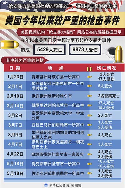 新華社北京5月19日電 新聞背景:美國(guó)今年以來較嚴(yán)重的槍擊事件