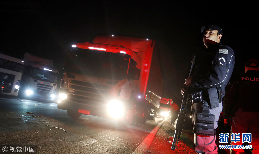 當(dāng)?shù)貢r(shí)間2018年5月26日,巴西圣貝爾納多杜坎普,卡車司機(jī)駕車封堵高速公路,抗議油價(jià)上漲。(圖片來(lái)源:視覺中國(guó))