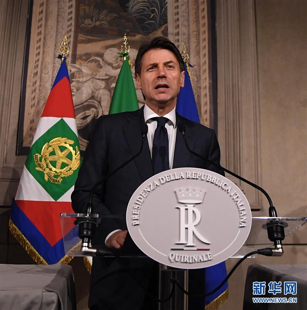 5月27日,在意大利首都羅馬,意新任總理孔特發(fā)表講話。據(jù)當(dāng)?shù)孛襟w報道,孔特27日晚間與總統(tǒng)馬塔雷拉會面并提交擬定的內(nèi)閣成員名單時,馬塔雷拉否決了由意大利聯(lián)盟黨和五星運動力推的持疑歐立場的經(jīng)濟(jì)學(xué)家保羅·薩沃納出任財政部長??滋叵蚩偨y(tǒng)提出放棄組閣任務(wù)請求,請求得到總統(tǒng)確認(rèn)。新華社發(fā)(阿爾貝托·林格里亞攝)