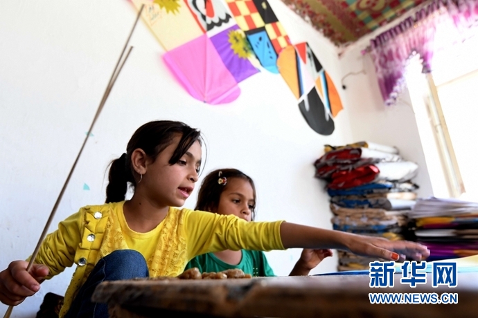 5月29日,在阿富汗首都喀布爾,希杰蘭(左)和妹妹在作坊內(nèi)扎風箏。對于阿富汗這個飽經(jīng)戰(zhàn)火洗禮的國度,風箏是人們難得的娛樂品。不少當?shù)睾⒆佑H手制作風箏貼補家用,可謂窮人的孩子早當家。九歲的希杰蘭過去幾年共制作了上萬個風箏。今年“六一”國際兒童節(jié)來臨之際,記者一行來到希杰蘭與家人位于喀布爾郊區(qū)的風箏作坊。在略顯簡陋的房間內(nèi),大大小小、五顏六色的紙張隨處可見,不足20平方米的作坊在陽光下如同一個彩色世界。新華社記者 代賀 攝