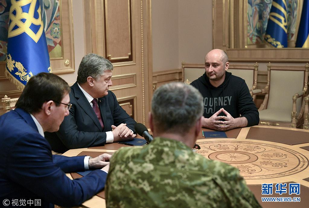 5月30日,烏克蘭基輔,烏克蘭總統(tǒng)波羅申科會(huì)見此前被報(bào)道“死亡”的俄羅斯記者巴布琴科。(圖片來源:視覺中國(guó))