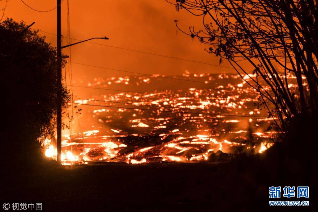 夏威夷火山持續(xù)噴發(fā) 燃燒巖漿映紅夜空