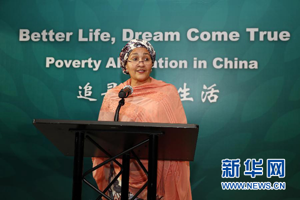 6月28日,在位于紐約的聯(lián)合國總部,聯(lián)合國常務(wù)副秘書長阿明娜·穆罕默德在“追尋美好生活”中國脫貧成就展開幕式上講話。? 新華社記者李木子攝