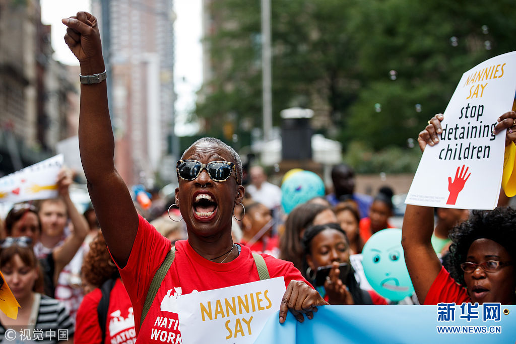 當(dāng)?shù)貢r間2018年7月18日,美國紐約,包括托兒所從業(yè)人員、父母及其子女在內(nèi)的社會各界人士在美國移民和海關(guān)執(zhí)法局(ICE)附近組織示威游行,抗議特朗普政府近期在美國南部邊境實(shí)施針對非法移民家庭的強(qiáng)制拘留和家庭成員離散政策。當(dāng)天,共和黨領(lǐng)導(dǎo)的眾議院通過了支持ICE的決議,并譴責(zé)一些民主黨人和進(jìn)步積極分子要求廢除ICE的呼聲。(圖片來源:視覺中國)