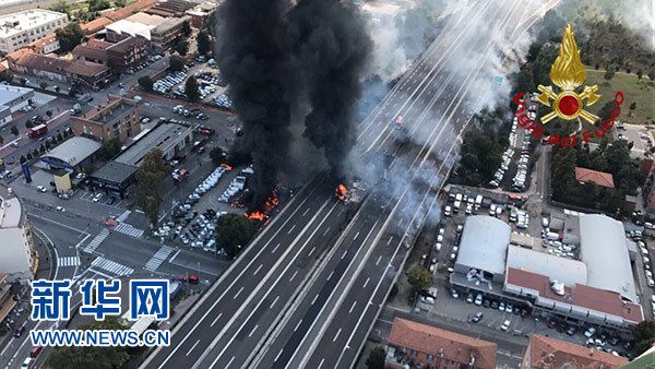 這張8月6日意大利消防部門發(fā)布在社交媒體推特上的照片顯示的是博洛尼亞油罐車爆炸事件現(xiàn)場。 新華社發(fā)