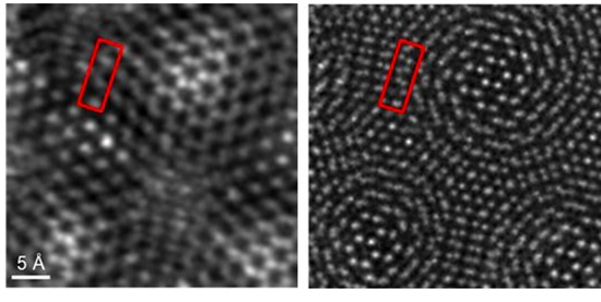 這是領(lǐng)先于過去成像方法的一個重要步驟,以前看不清是因?yàn)樘綔y器只收集了一部分散射的電子。此前,在同樣的低電壓情況下,得到的空間分辨率一般小于0.1納米。兩張圖相比,一個線條模糊,一個能看得顆粒分明。