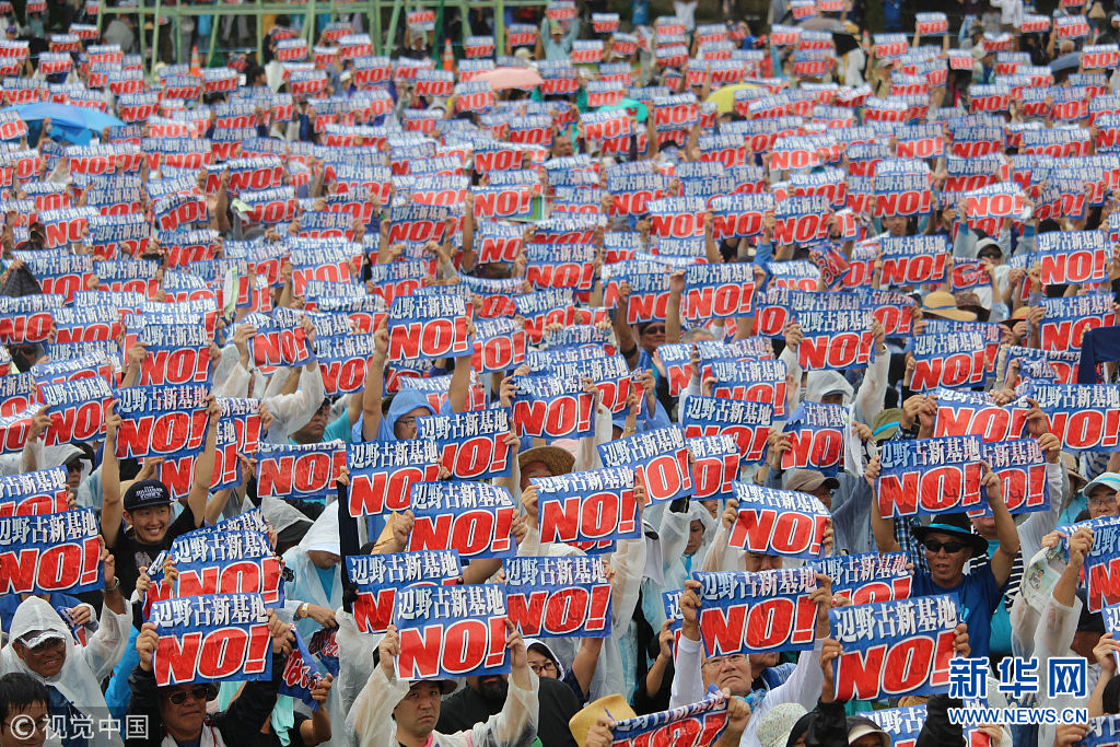 當地時間2018年8月11日,日本沖繩縣約7萬民眾8月11日在那霸市舉行大規(guī)模集會,反對駐日美軍將普天間基地遷往名護市邊野古地區(qū),要求駐日美軍放棄在邊野古地區(qū)新建基地并立即關閉普天間機場。當天,日本東京都、大阪府、福岡、北海道縣等地民眾也同時舉行集會和游行,抗議日本政府推進邊野古地區(qū)填海施工。(圖片來源:視覺中國)