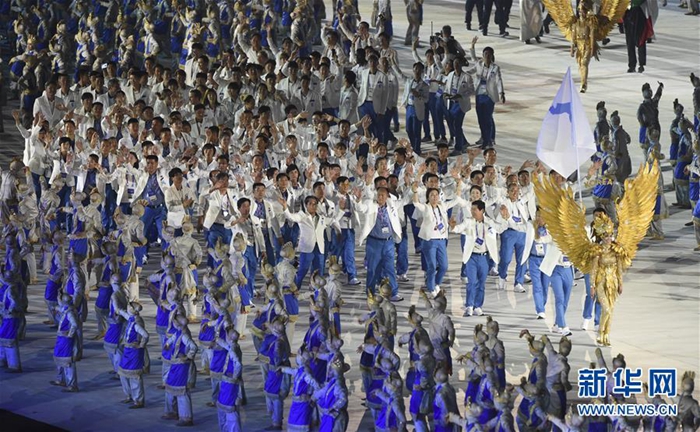 新華社雅加達(dá)8月18日電(記者 陸睿)第18屆亞運會當(dāng)?shù)貢r間18日晚7時在雅加達(dá)朋加諾體育場揭開帷幕。繼今年2月韓國平昌冬奧會開幕式之后,朝鮮和韓國體育代表團(tuán)再次攜手在國際體育盛會共同入場,引發(fā)現(xiàn)場觀眾歡呼。
